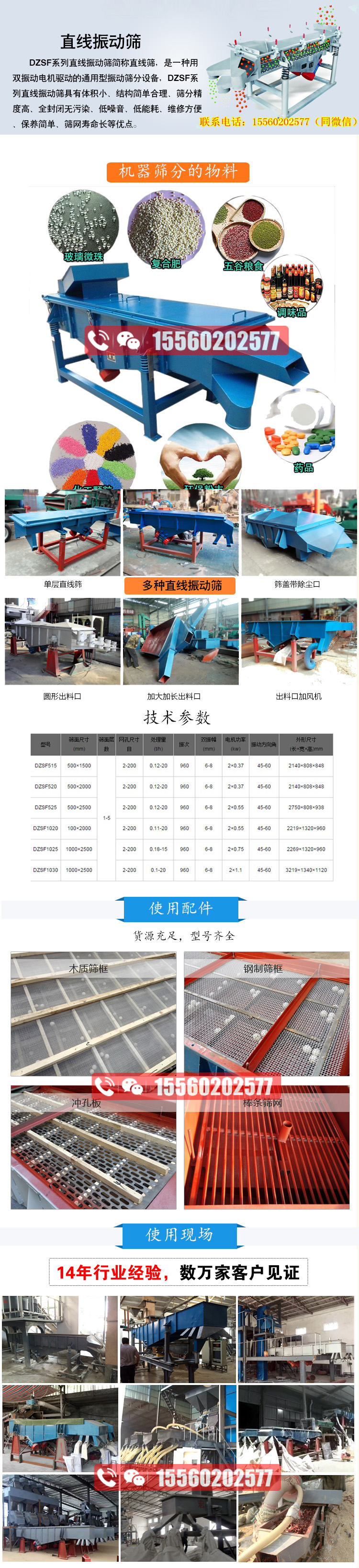 【產品簡介】DZSF直線振動篩是由機架、機體、篩框、篩網、清網球、電機等配件組成,一般使用在化工行業的比較多,比如說:河沙、石灰、石子等,糧食行業也可以使用,比如說:綠豆、黃豆、麥糠等都可以篩分。這臺機器的主要功能是大小分級、篩分, DZSF系列直線振動篩具有體積小、結構簡單合理、篩分精度高、全封閉無污染、低噪音、低能耗、維修方便、保養簡單、篩網壽命長等優點。可單層或多層使用,最多可達到五層,篩框一般為木制結構,若篩孔較大,產量較高時篩框可制成鋼質結構,若篩分腐蝕性物料,與物料接觸部分采用不銹鋼制作。電機安裝方式可分